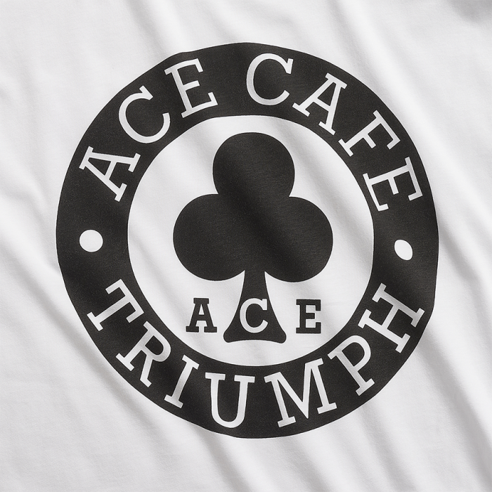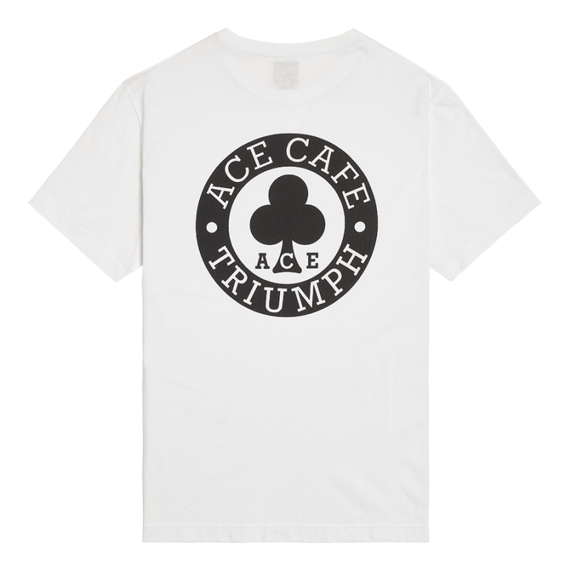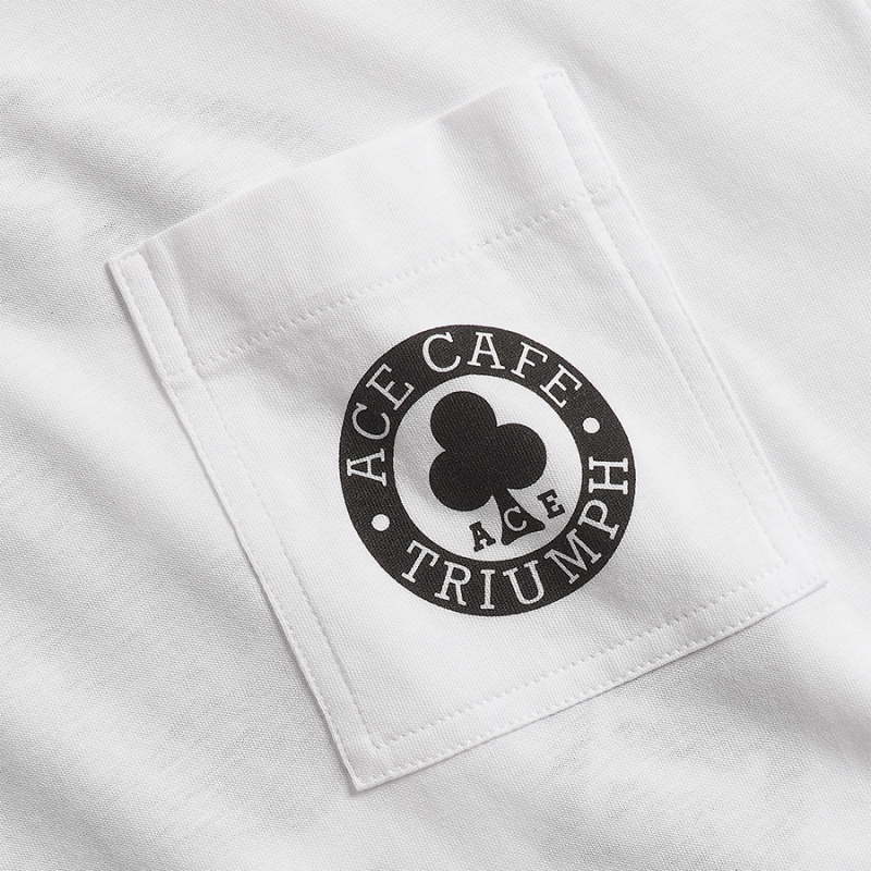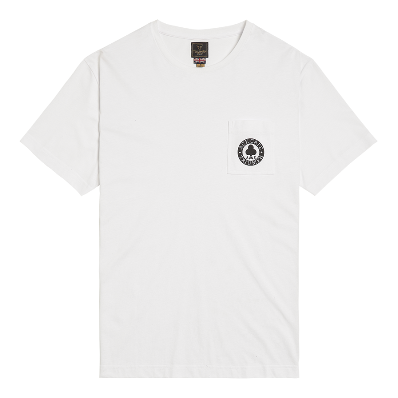 Soft 100% cotton tee with the iconic Ace Cafe Triumph graphic on the back and a patch chest pocket featuring a small logo on the front.UPS Shipping