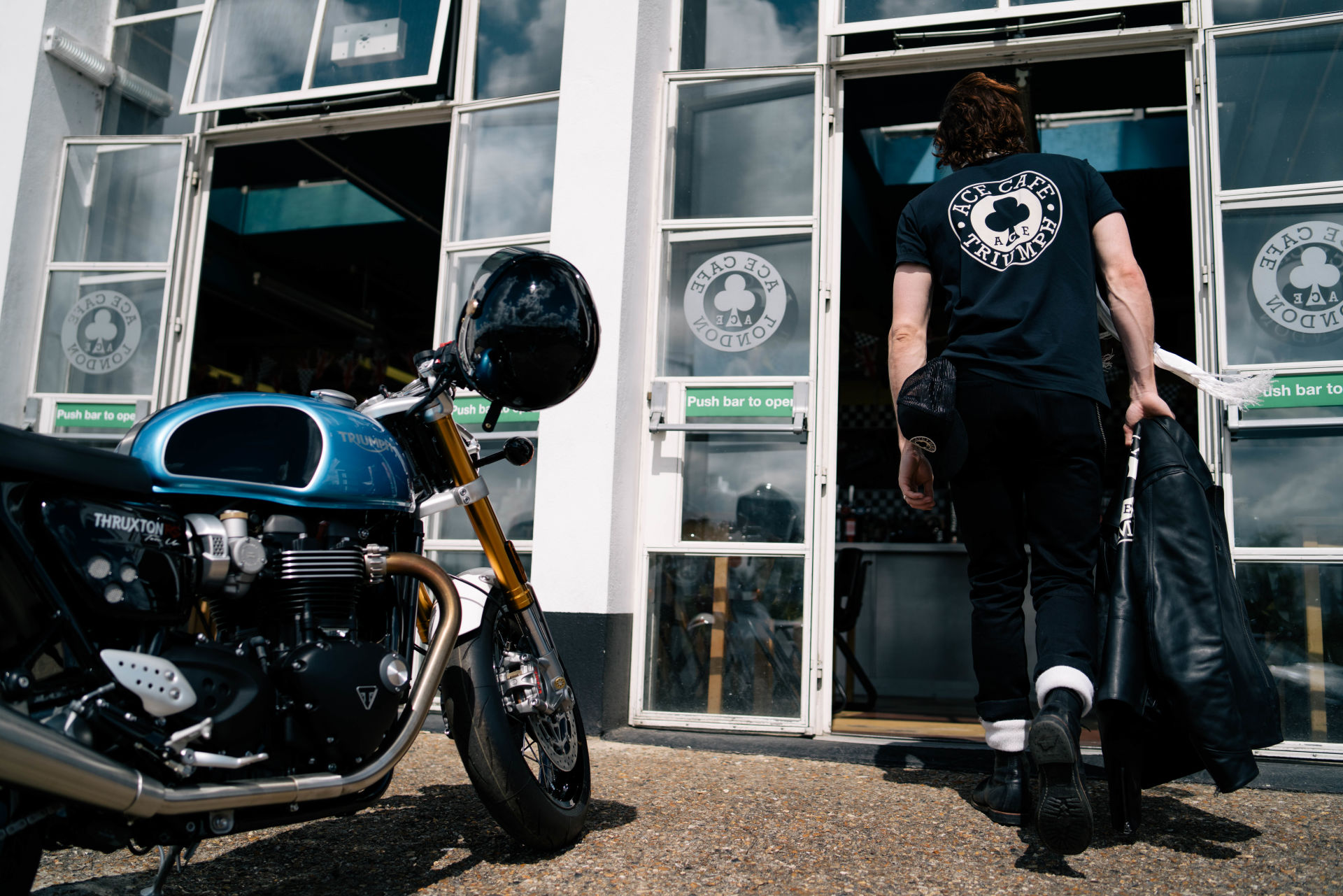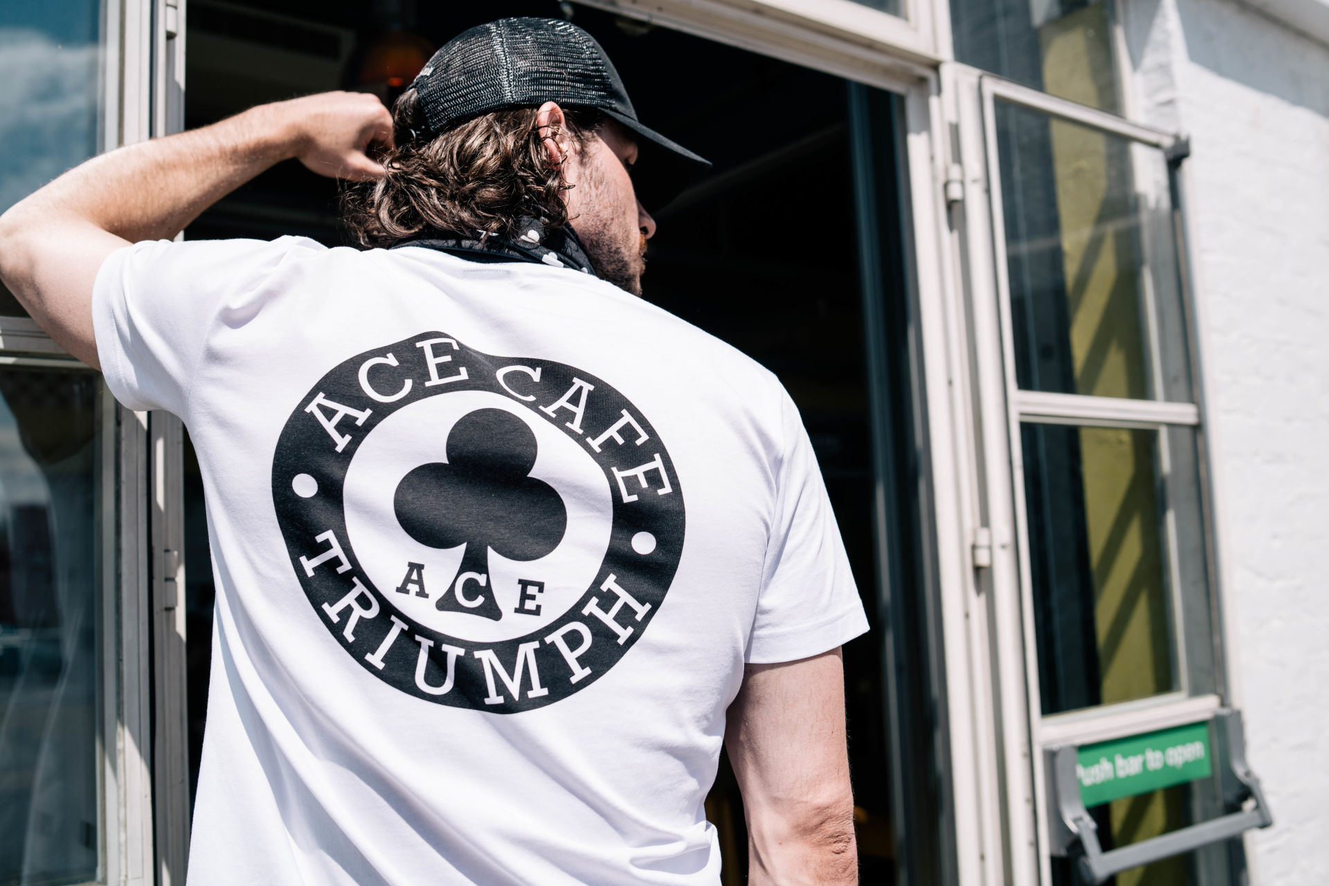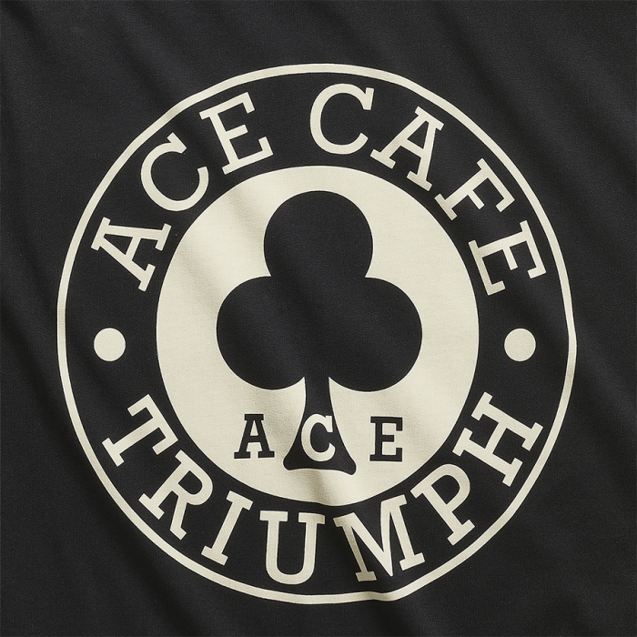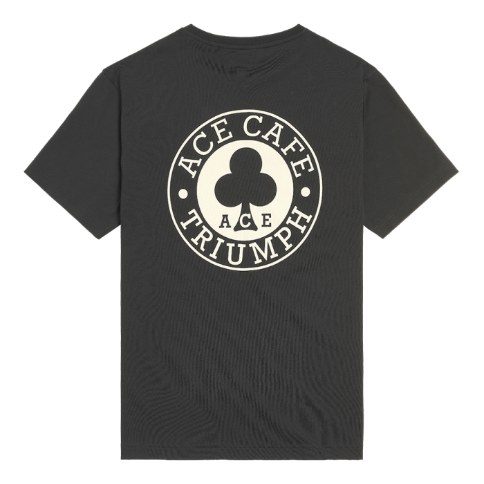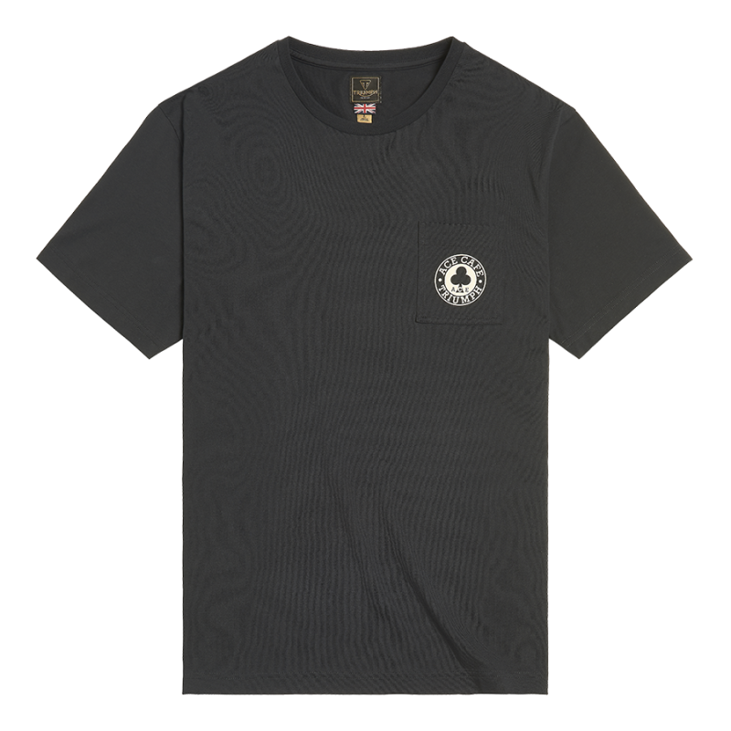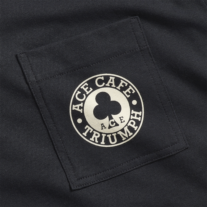 Soft 100% cotton tee with the iconic Ace Cafe Triumph graphic on the back and a patch chest pocket featuring a small logo on the front.UPS Shipping
