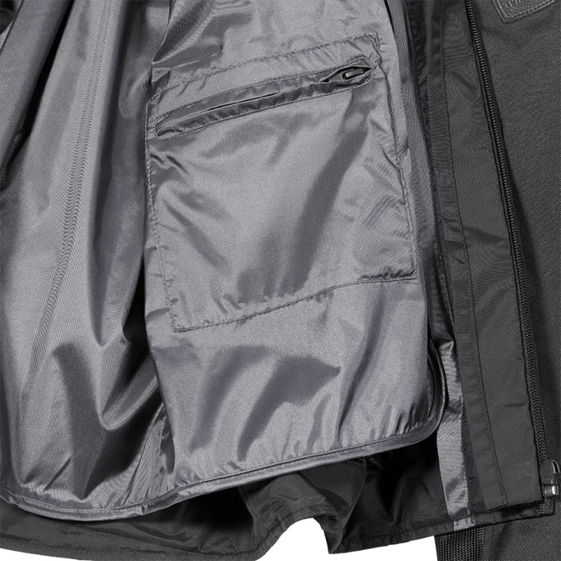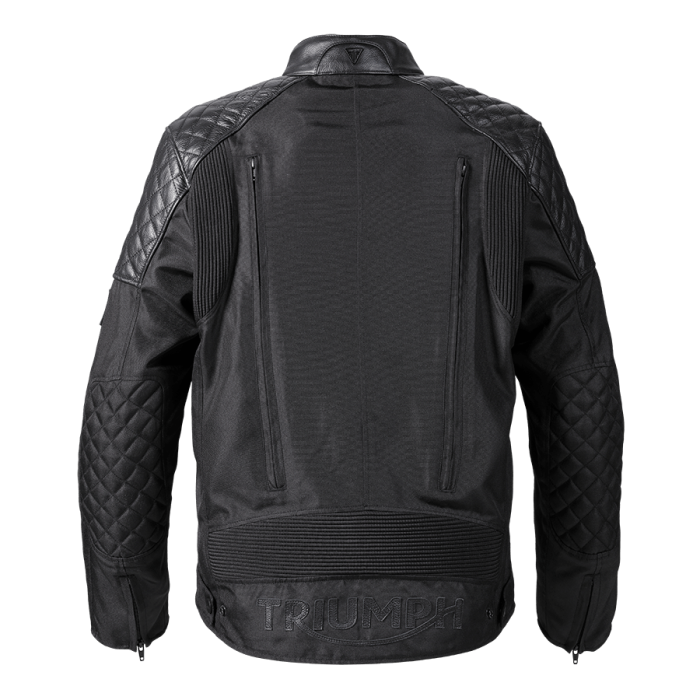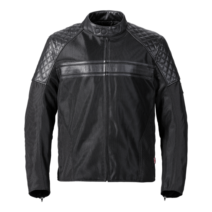 A classic racer neck biker jacket in mesh textile and leather panels.UPS Shipping