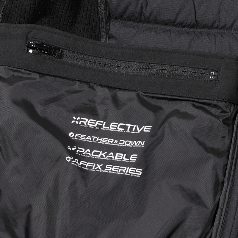 The Mid Layer Hybrid Jacket is one of our midlayer pieces and is part of our Affix series, specifically designed to be worn under any of our adventure touring outer jackets. Maintain the heat where you need it with our clever body mapped midlayer, it provides insulation to the exposed zones with less bulk allowing for unrestrictive movement and a comfortable fit. The lightweight design contains a baffle style tubing which holds a down and feather combination 90/10, 700 fill that traps heat to evenly distribute throughout, ensuring ultimate temperature stability. This jacket also packs down neatly into its own storage compartment, so you can keep it handy and clean in your bag or bike box.UPS Shipping