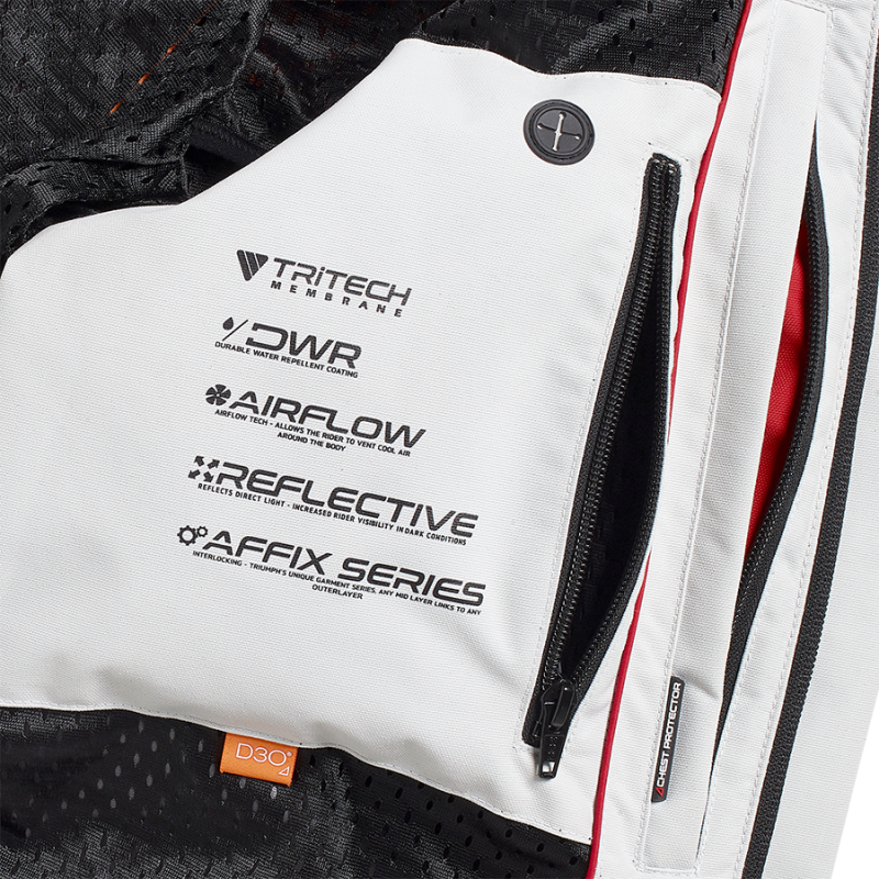 Refined adventure styling with comfort and functionality from a jacket constructed with a breathable waterproof TriTech membrane lining. The jacket incorporates removable D3O® shoulder, elbow and back protectors while dark reflective inserts provide better visibility and is part of Triumph's unique Affix Series.UPS Shipping
