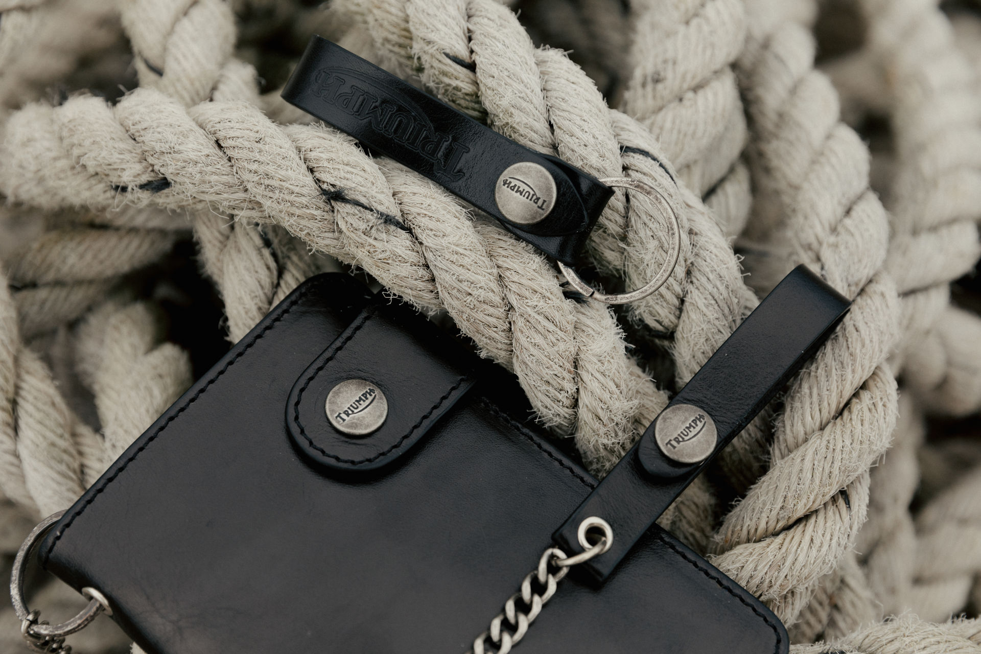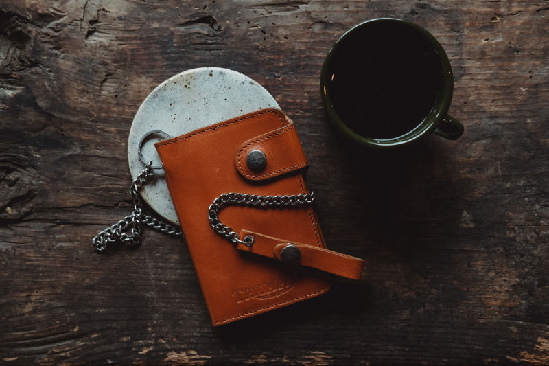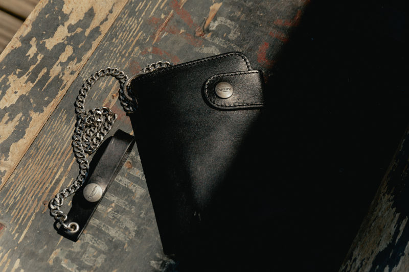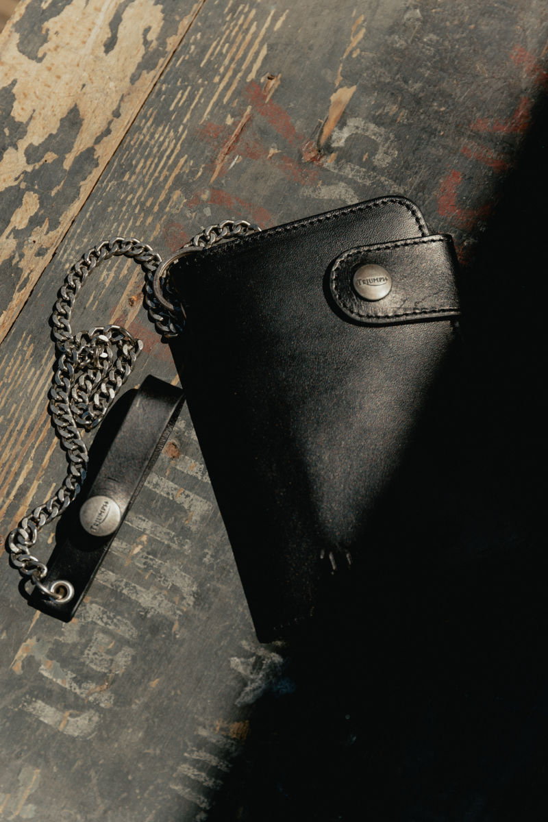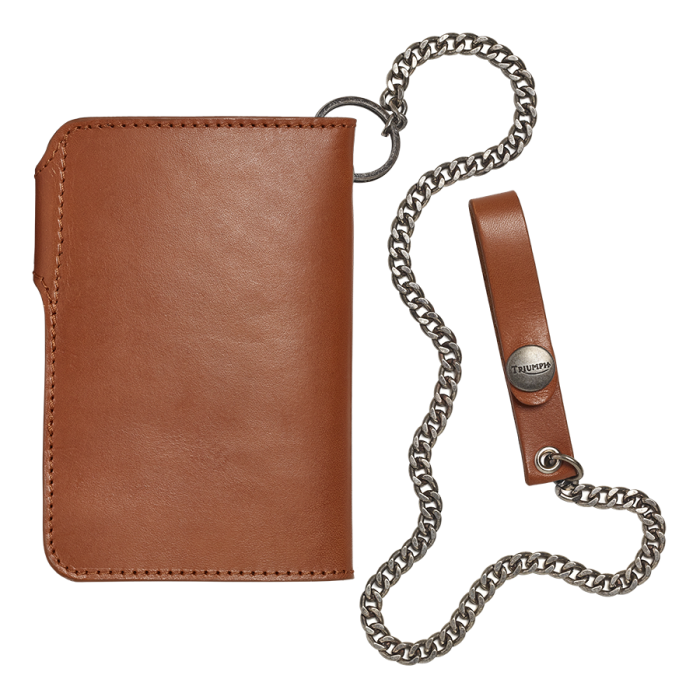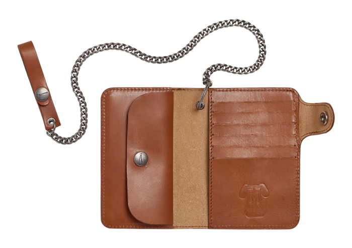 This classic biker wallet design is crafted from strong durable top grain premium leather meaning it will get better with age and last for years to come. It provides compartments for cards, notes and coins, fastens with a metal popper closure. It comes with an attached chain with leather key fob allowing the wearer to attach the wallet onto jeans or a belt for added security. Made in Portugal, available in Black and Tan.UPS Shipping
