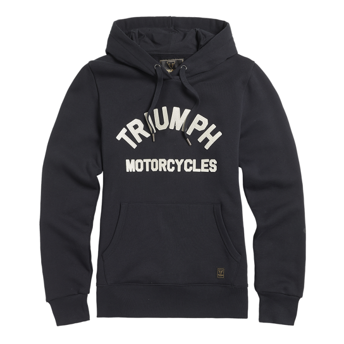 Womens heavyweight, fleece back cotton hooded sweatshirt in Jet Black with arched Triumph Motorcycles applique lettering in Bone, kangaroo pocket and drawstring hood.UPS Shipping