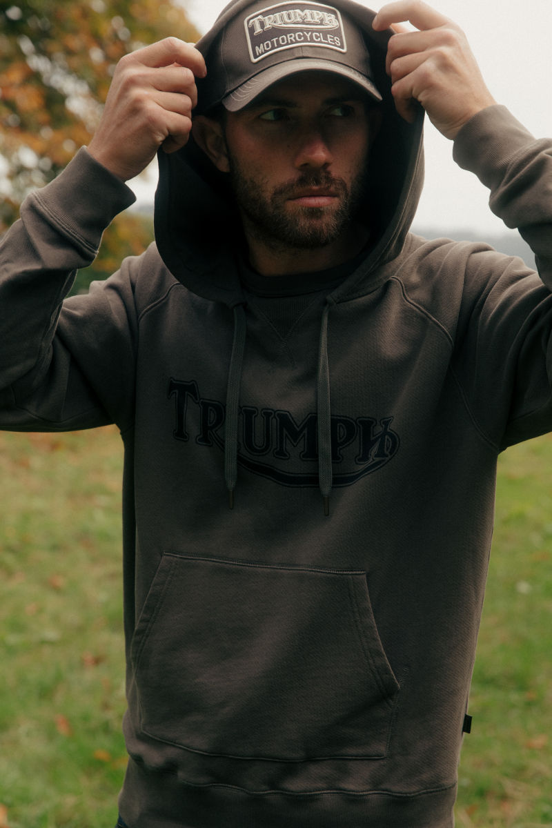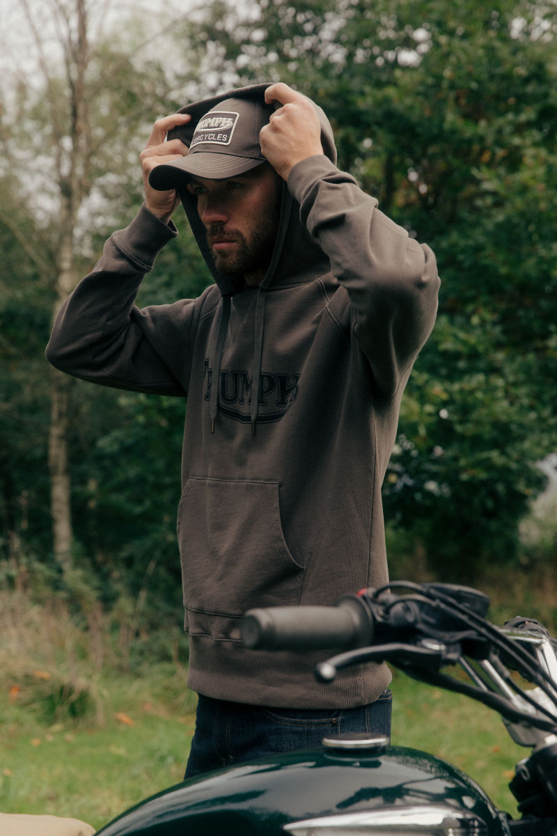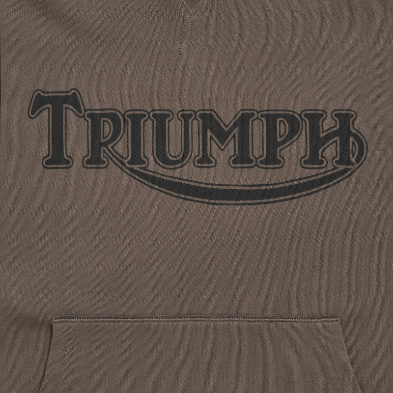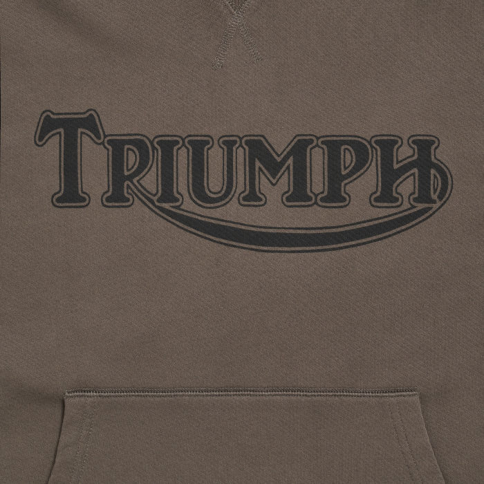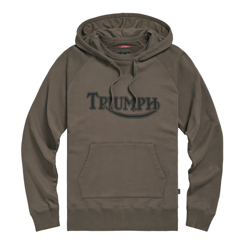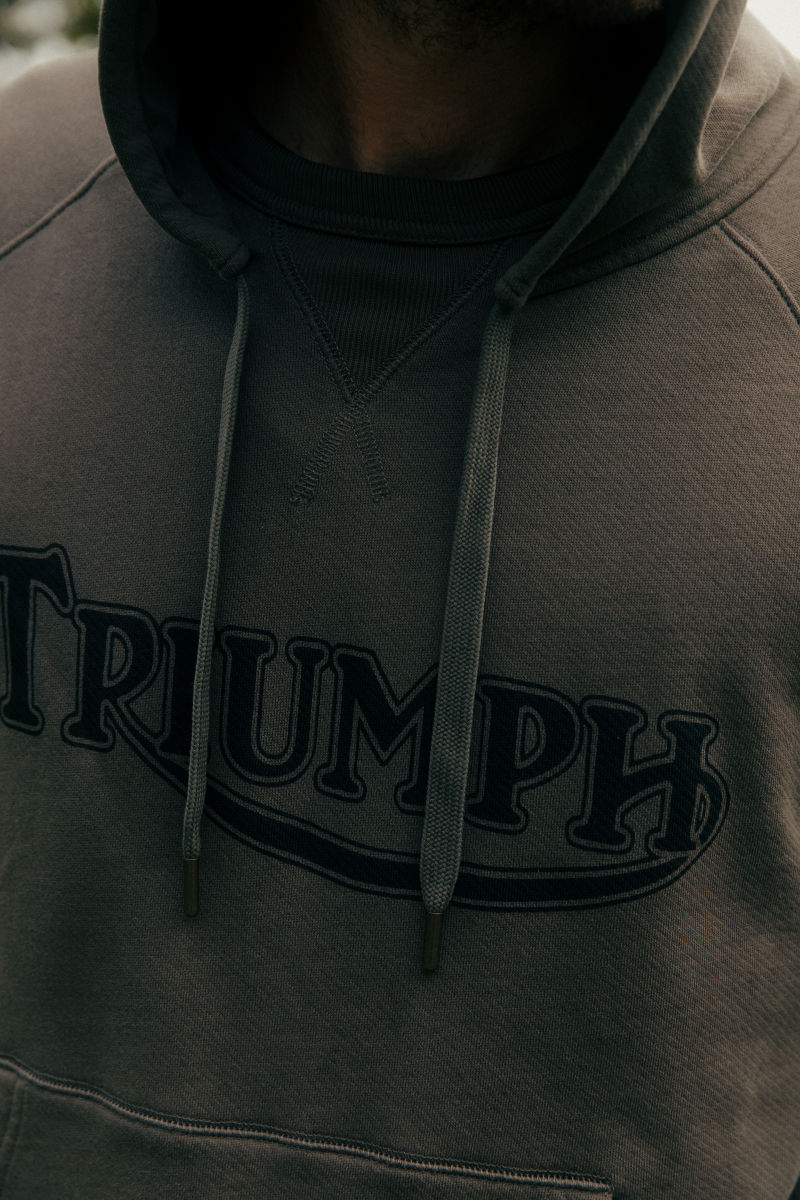 Classic fit heavyweight 400gsm cotton twill hoodie with military overlaid hoodie, kangaroo pocket, v-insert at neck and large Triumph Heritage Logo front and center.