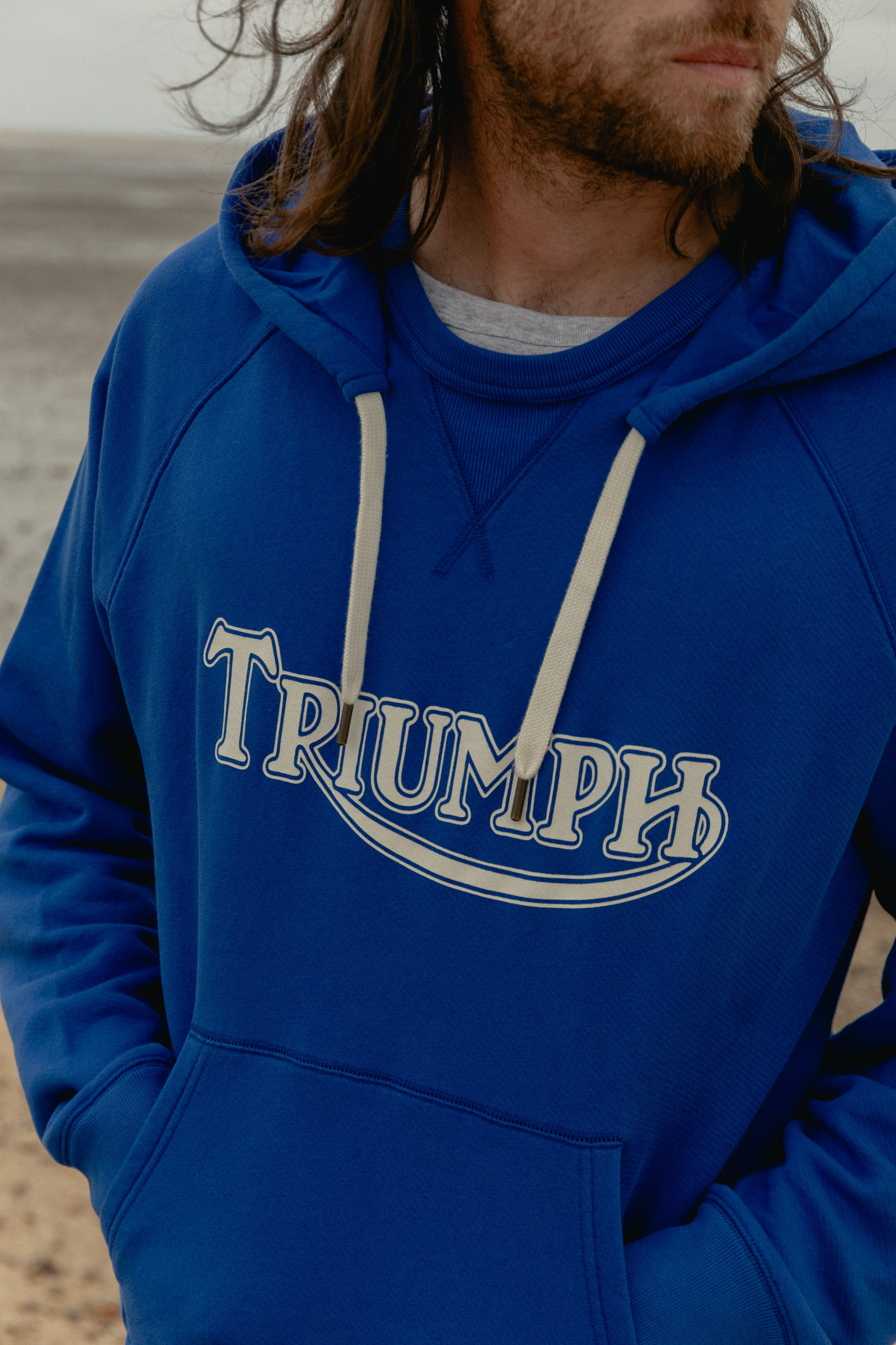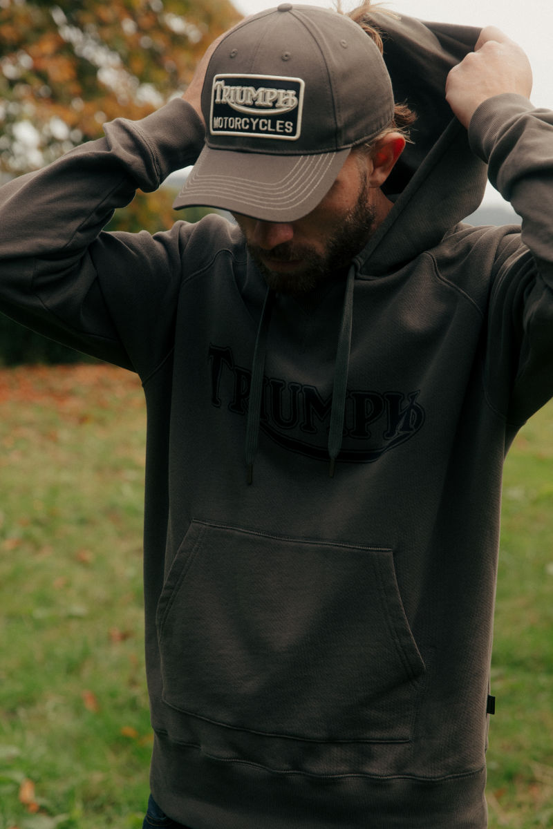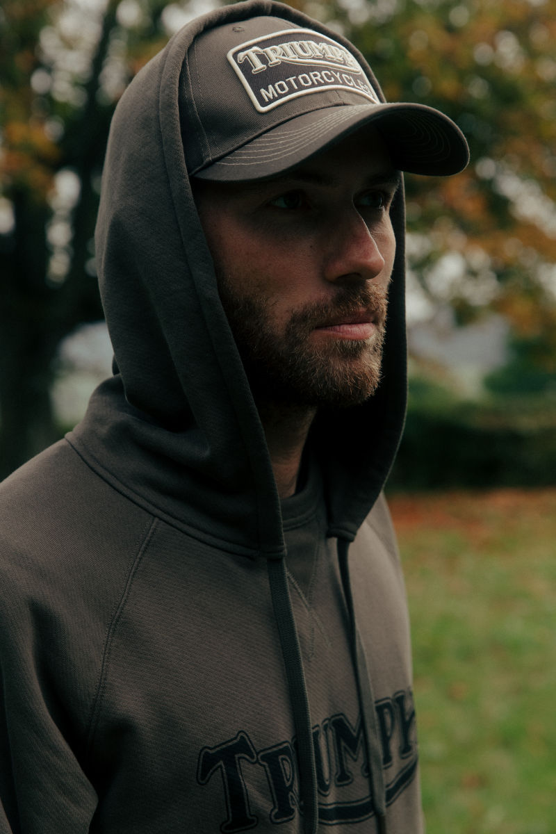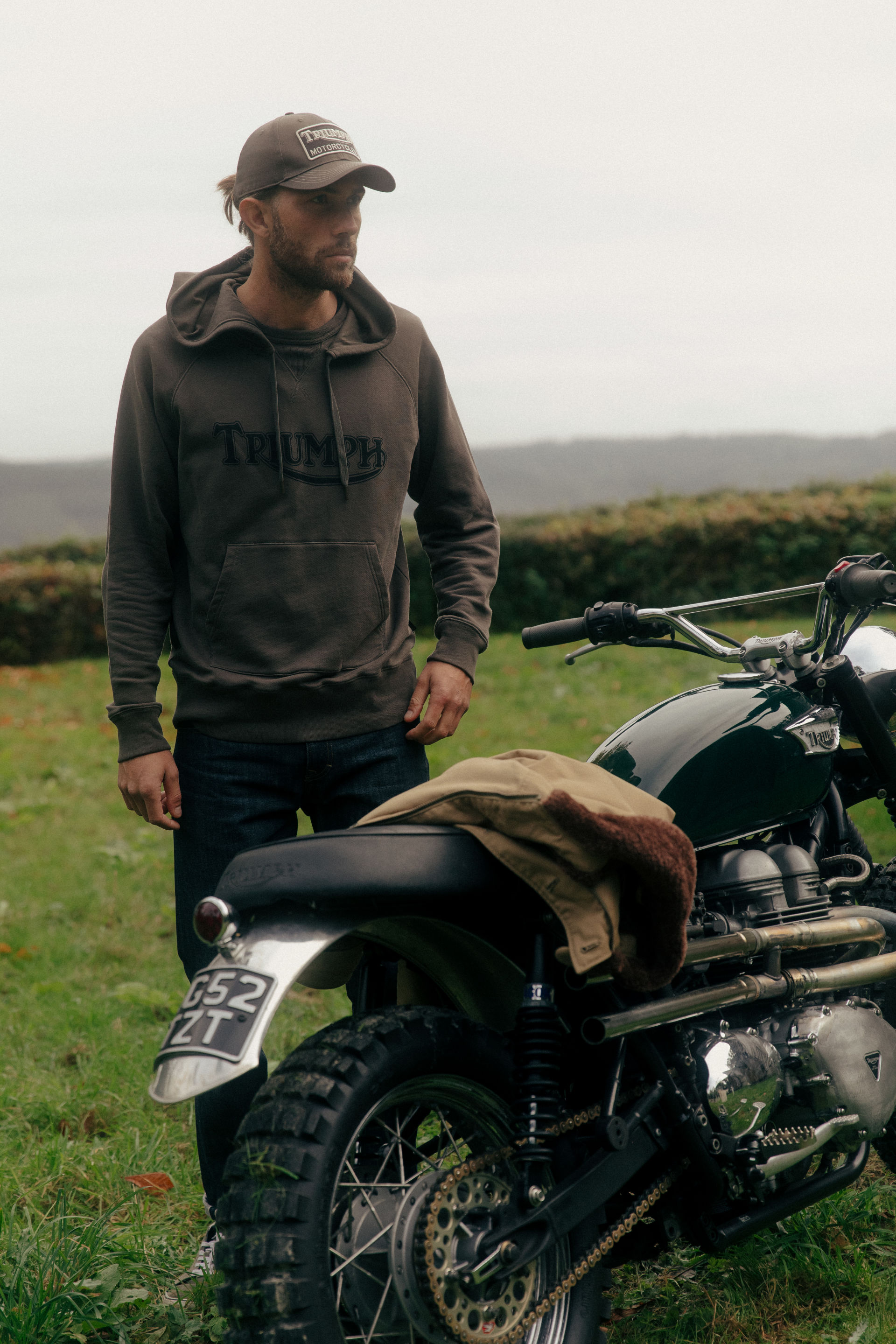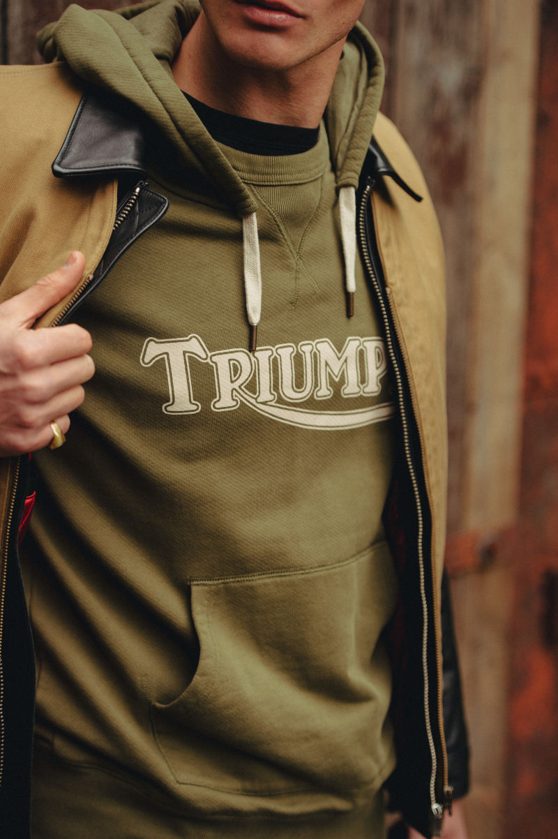 Classic fit heavyweight 400gsm cotton twill hoodie with military overlaid hoodie, kangaroo pocket, v-insert at neck and large Triumph Heritage Logo front and center.