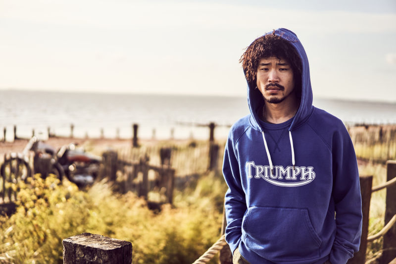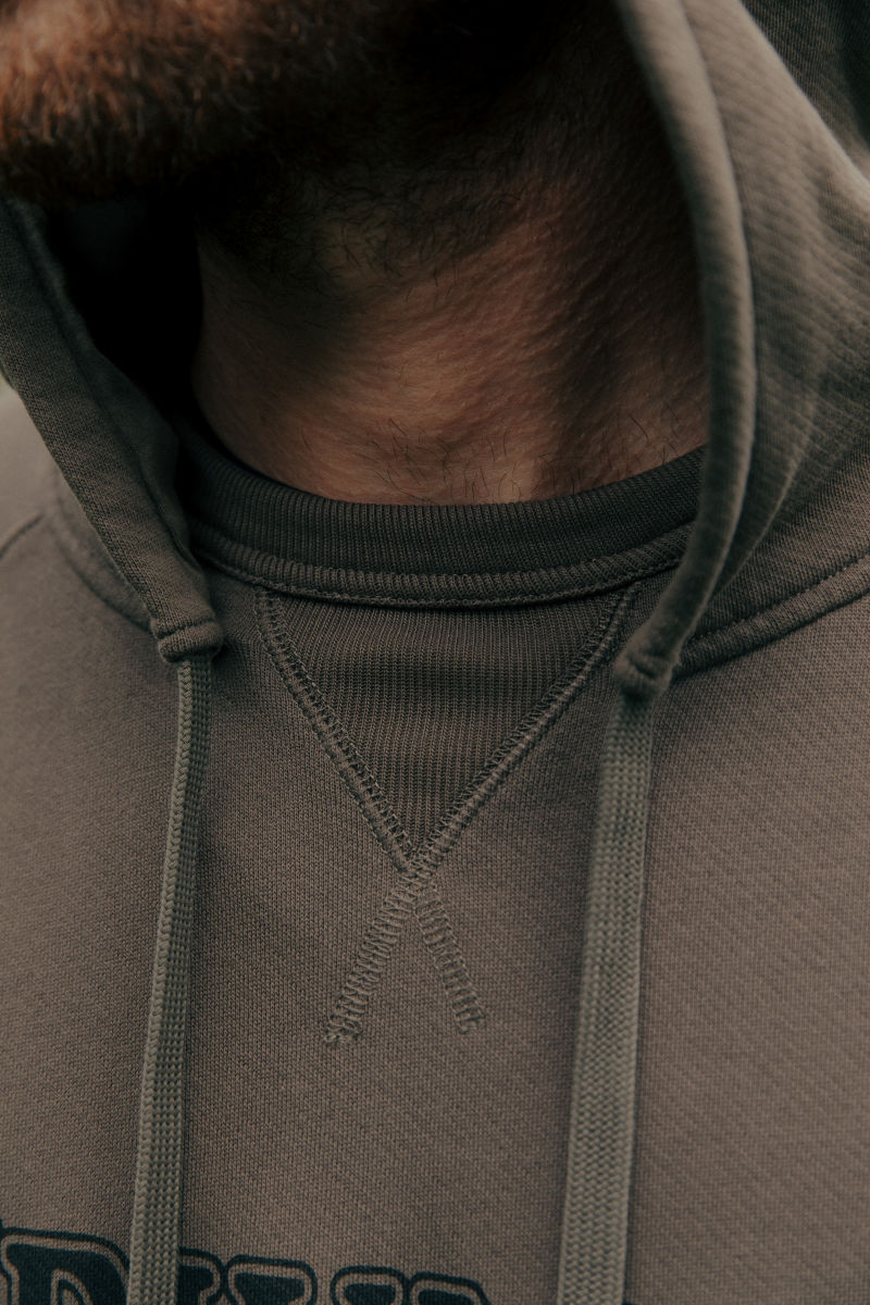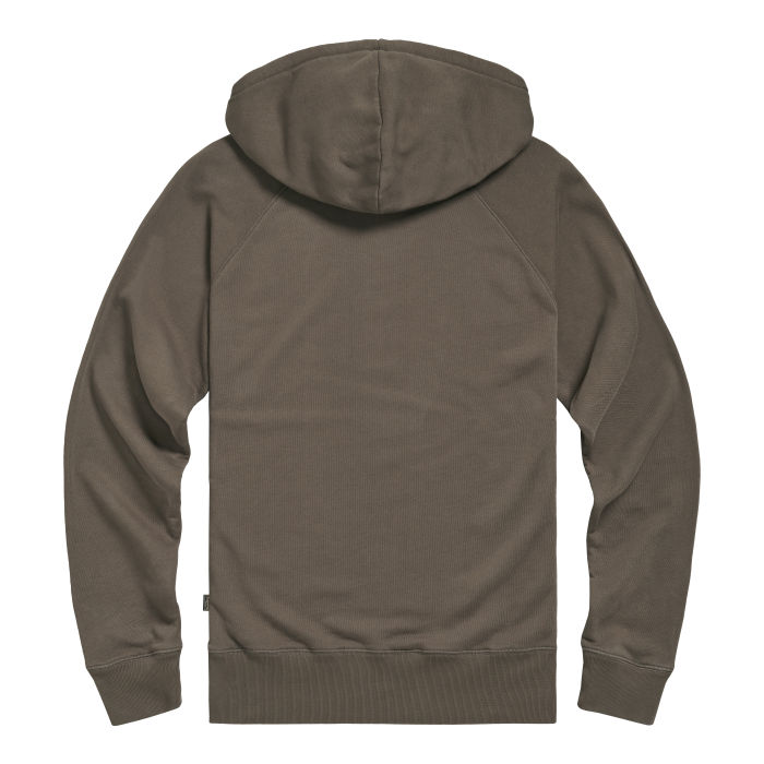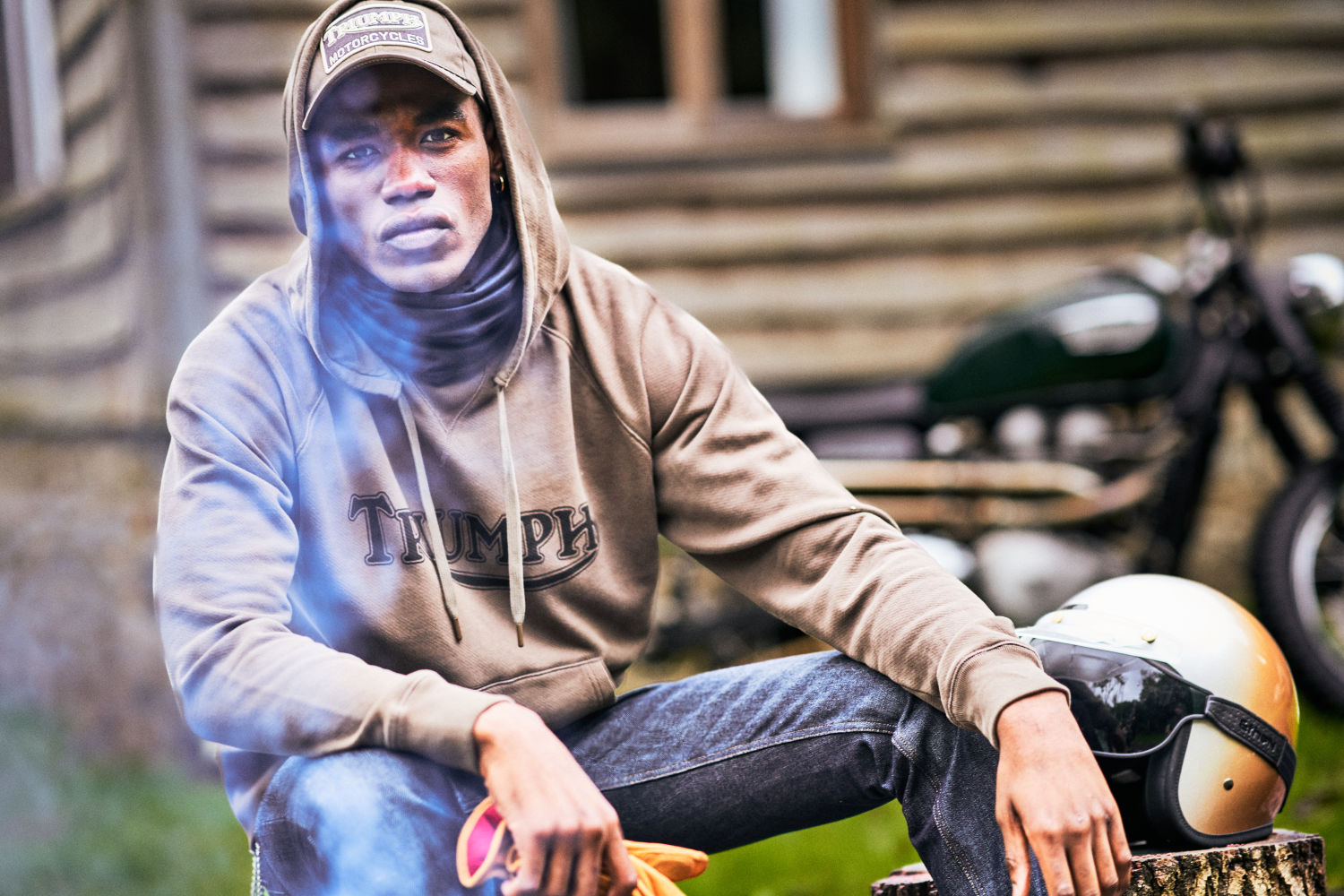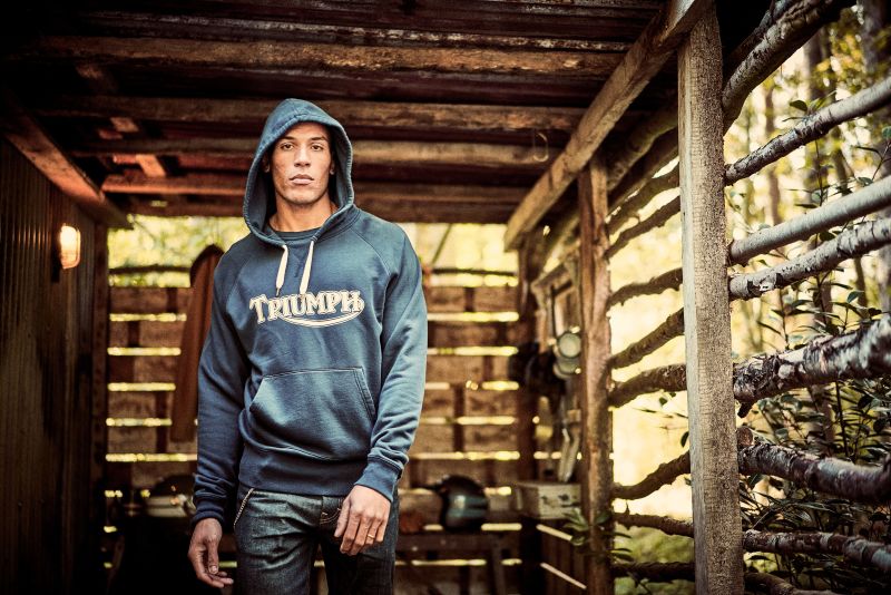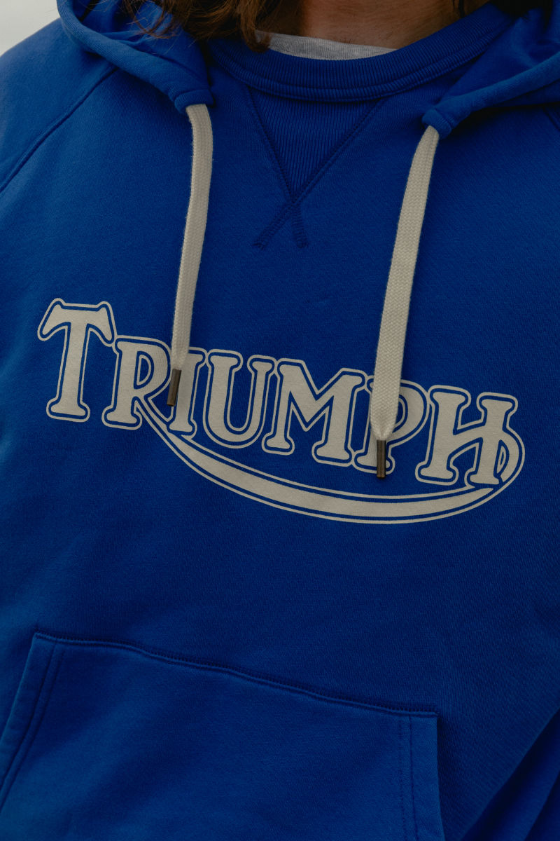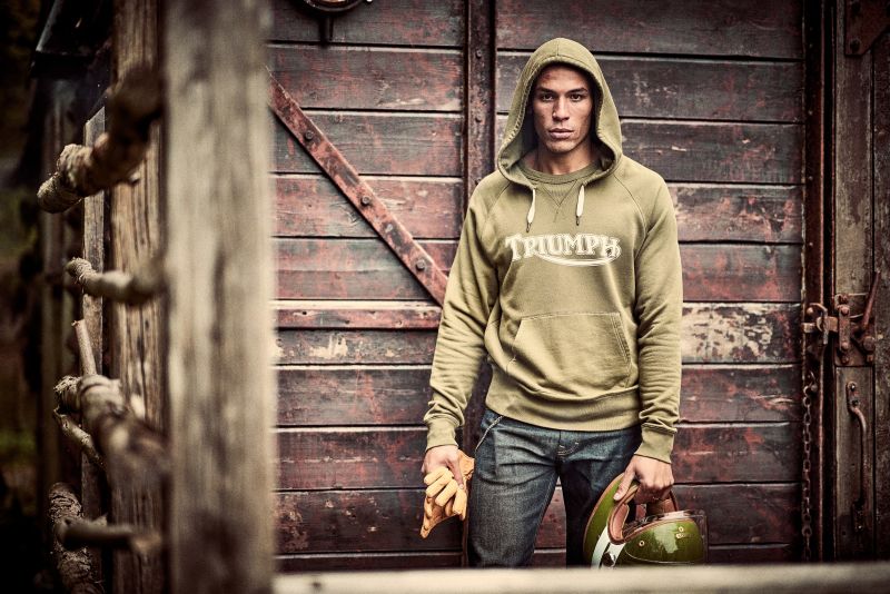 Classic fit heavyweight 400gsm cotton twill hoodie with military overlaid hoodie, kangaroo pocket, v-insert at neck and large Triumph Heritage Logo front and center.
