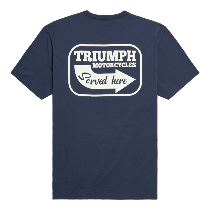 Classic fit crew neck, 100% cotton 160gsm Tee, with authentic V-insert neck detail and pocket to left chest. Indigo cotton jersey, featuring soft-feel 'Triumph Motorcycles Served Here' print on the back.UPS Shipping