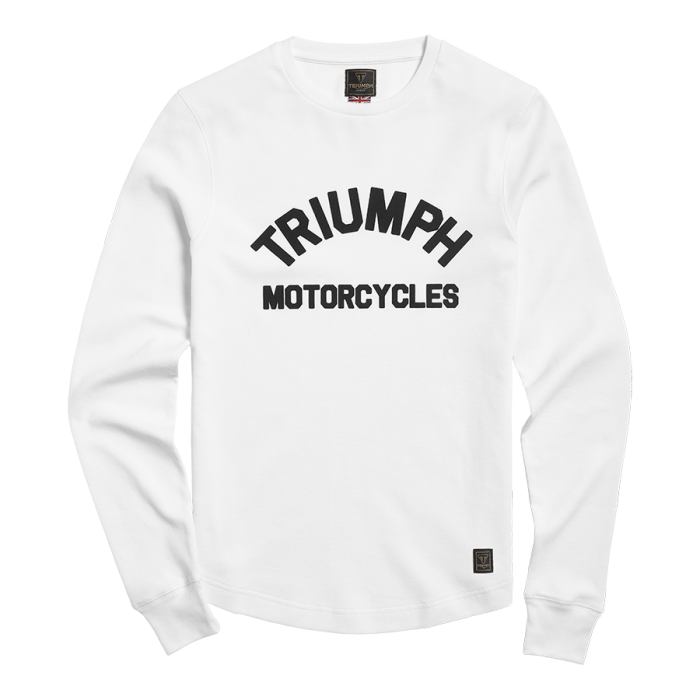 A long sleeve waffle texture cotton tee, with eye-catching arched Triumph Motorcycles printed on the chest.UPS Shipping