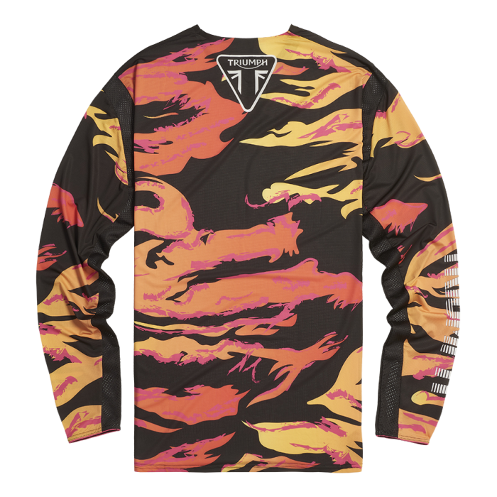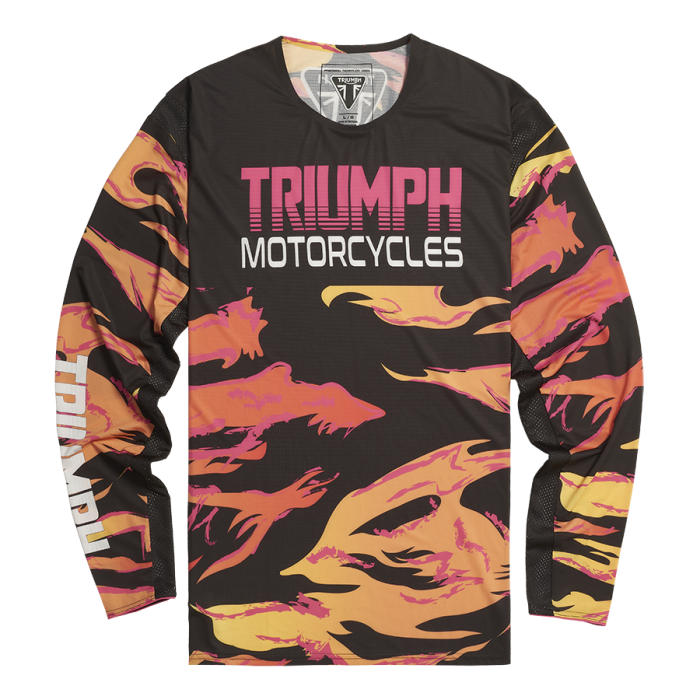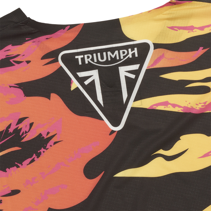 This combination ensures a feather-light and breathable feel, offering riders unparalleled comfort and freedom of movement. Featuring tiger stripe all-over print with Triumph Motorcycles lettering on the chest. This item is larger than standard and can be worn over body armour if desired.
