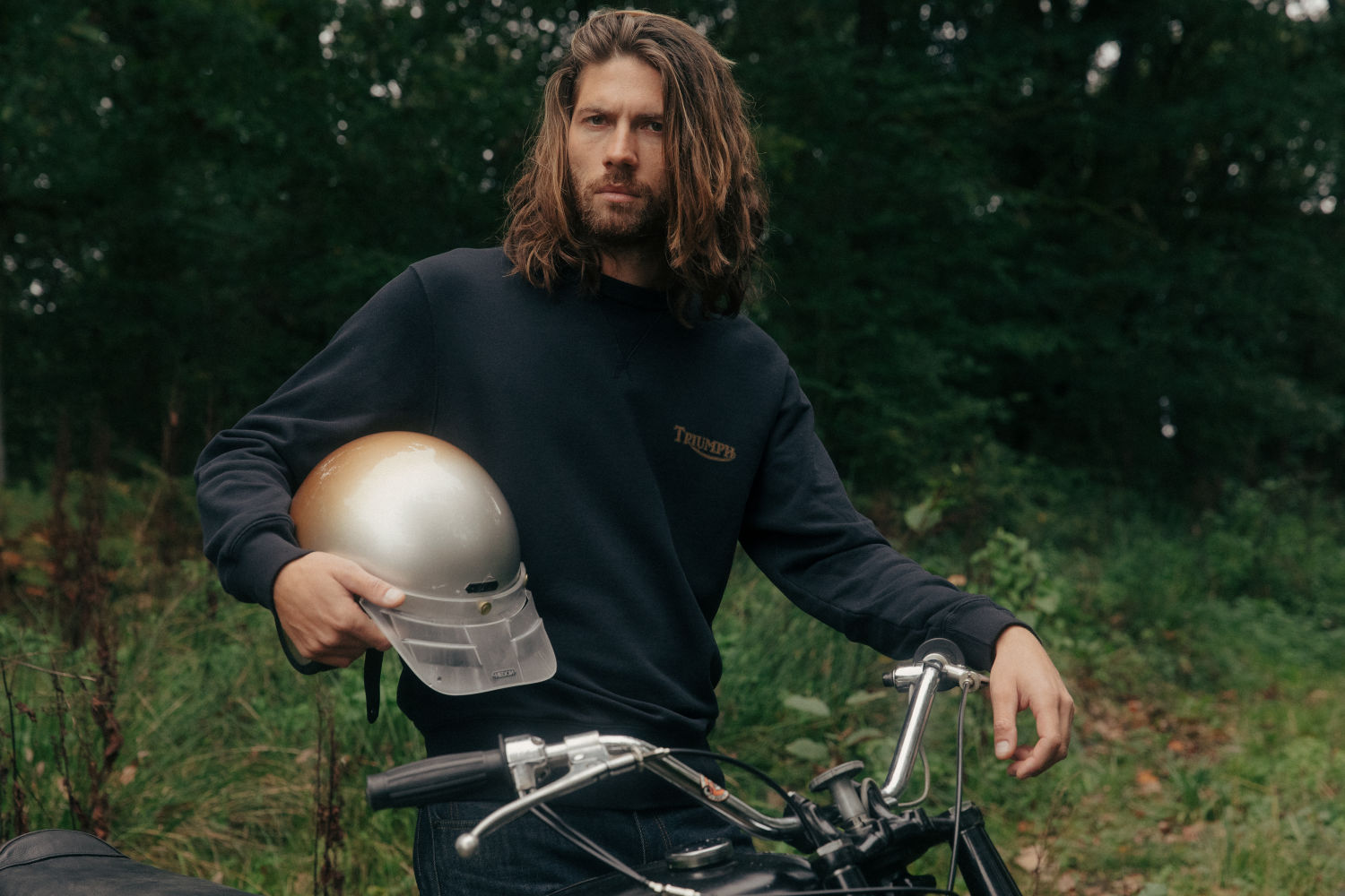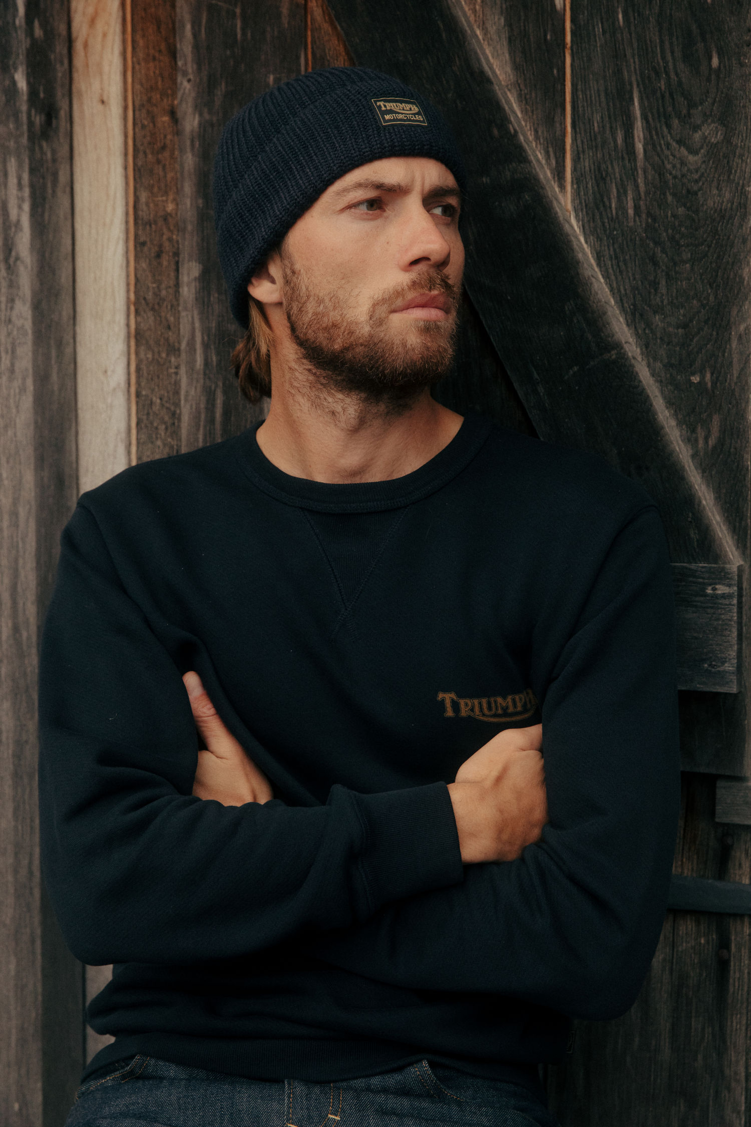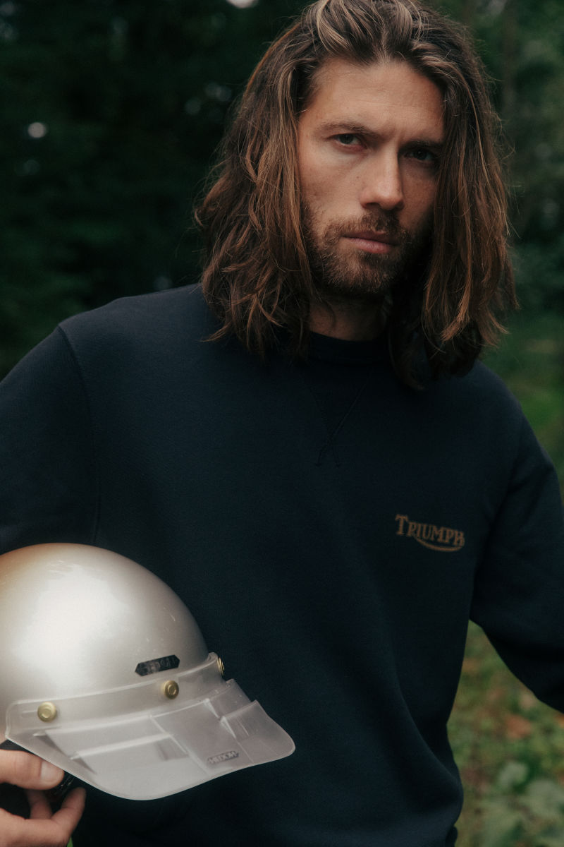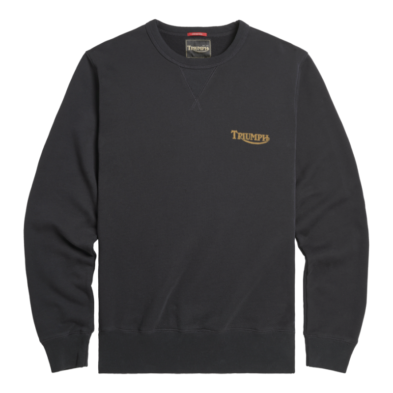 This regular-fit sweat is finished with classic ribbed V-insert at neck, ribbed cuffs and hem, and a subtle Triumph heritage logo print to the left chest.