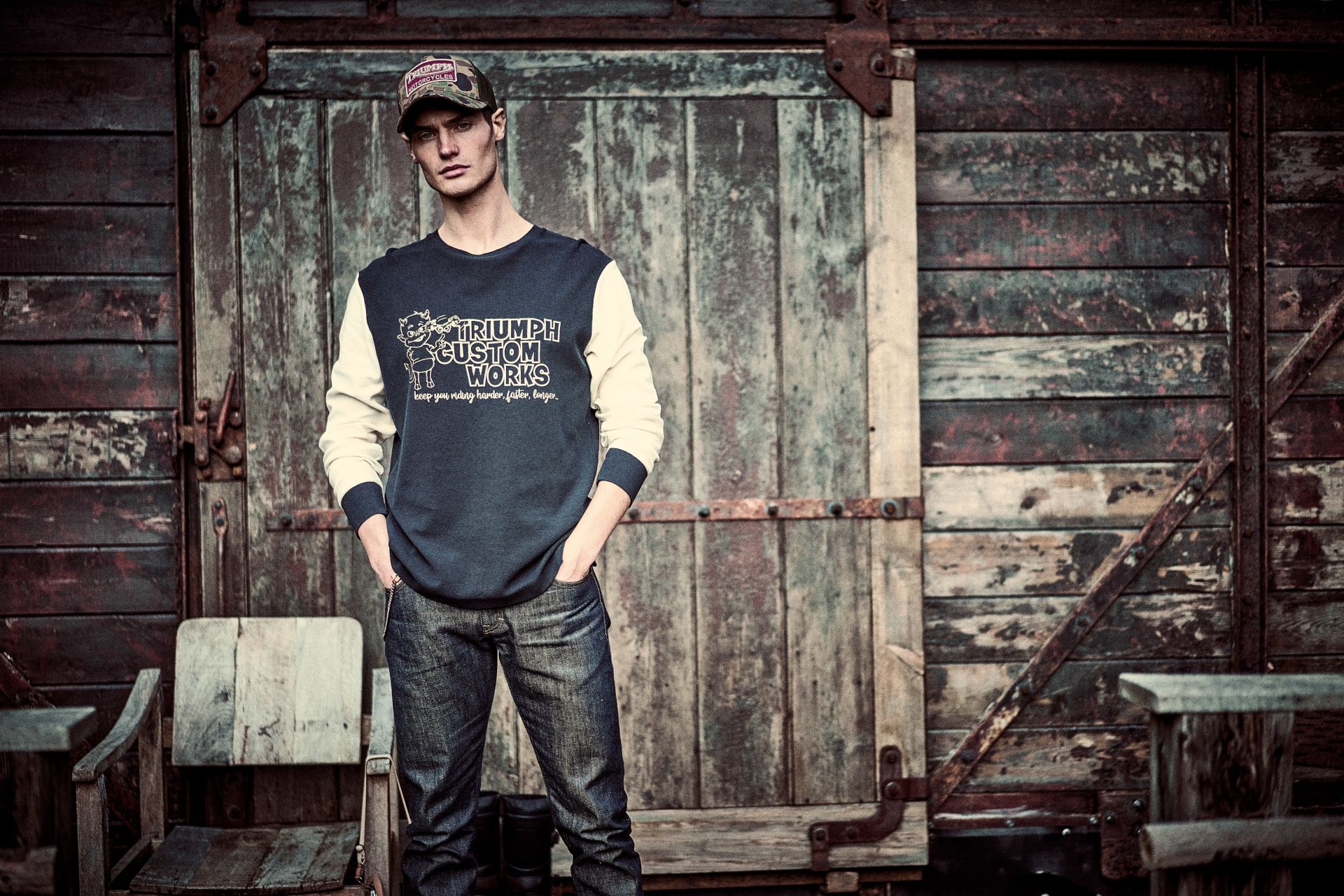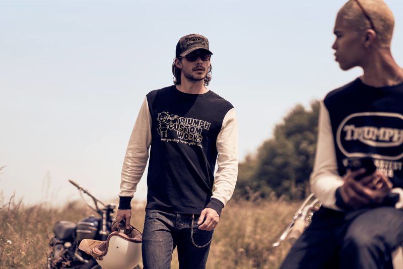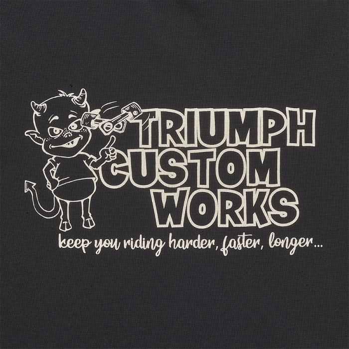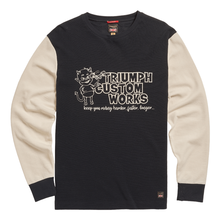 A classic fit crew neck long sleeve tee constructed in 100% cotton waffle texture. Imprinted with soft-feel Triumph Custom Works to the front chest, and sleeves in contrasting color.UPS Shipping