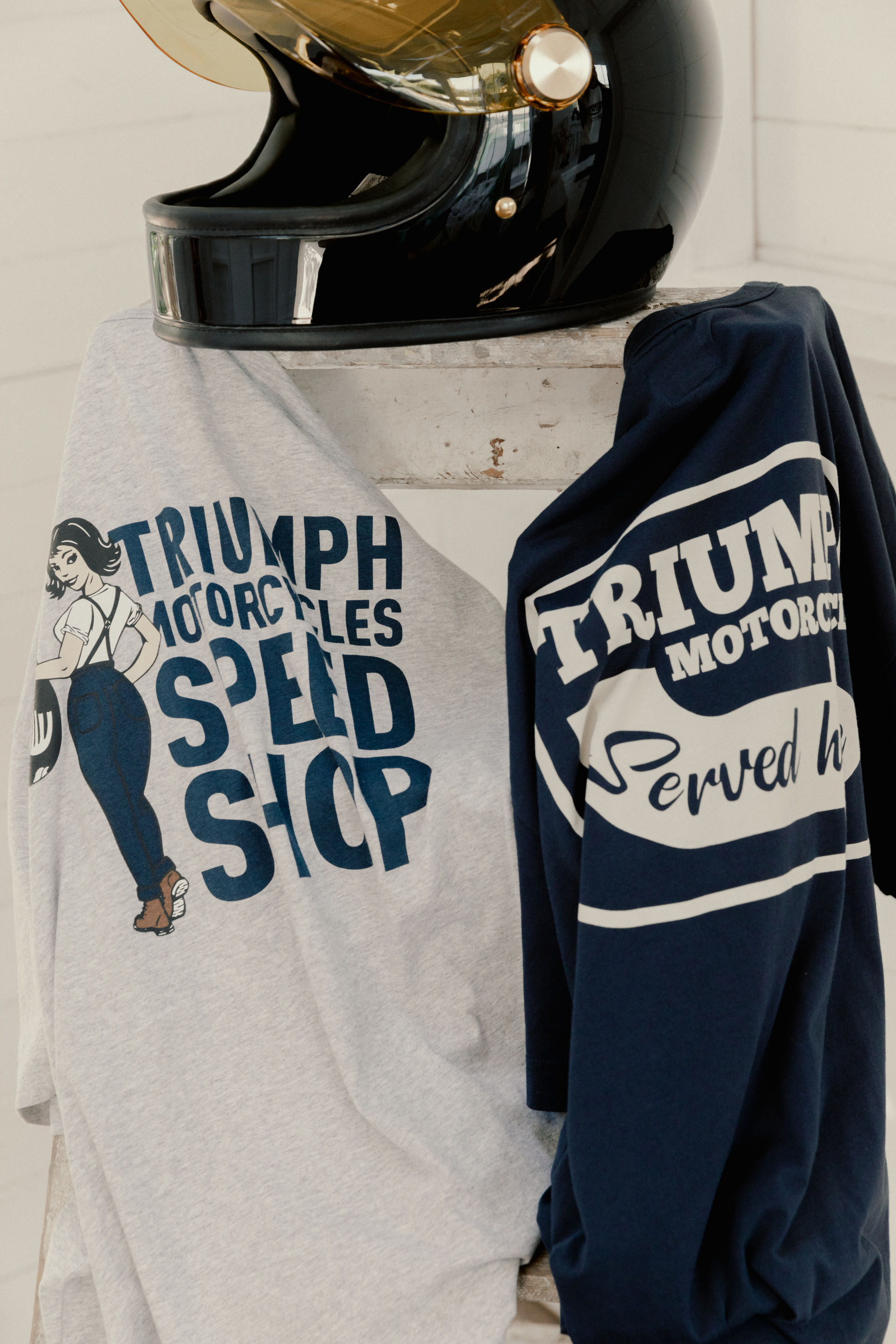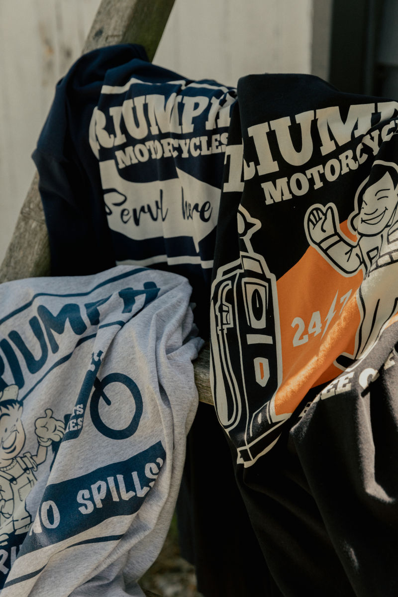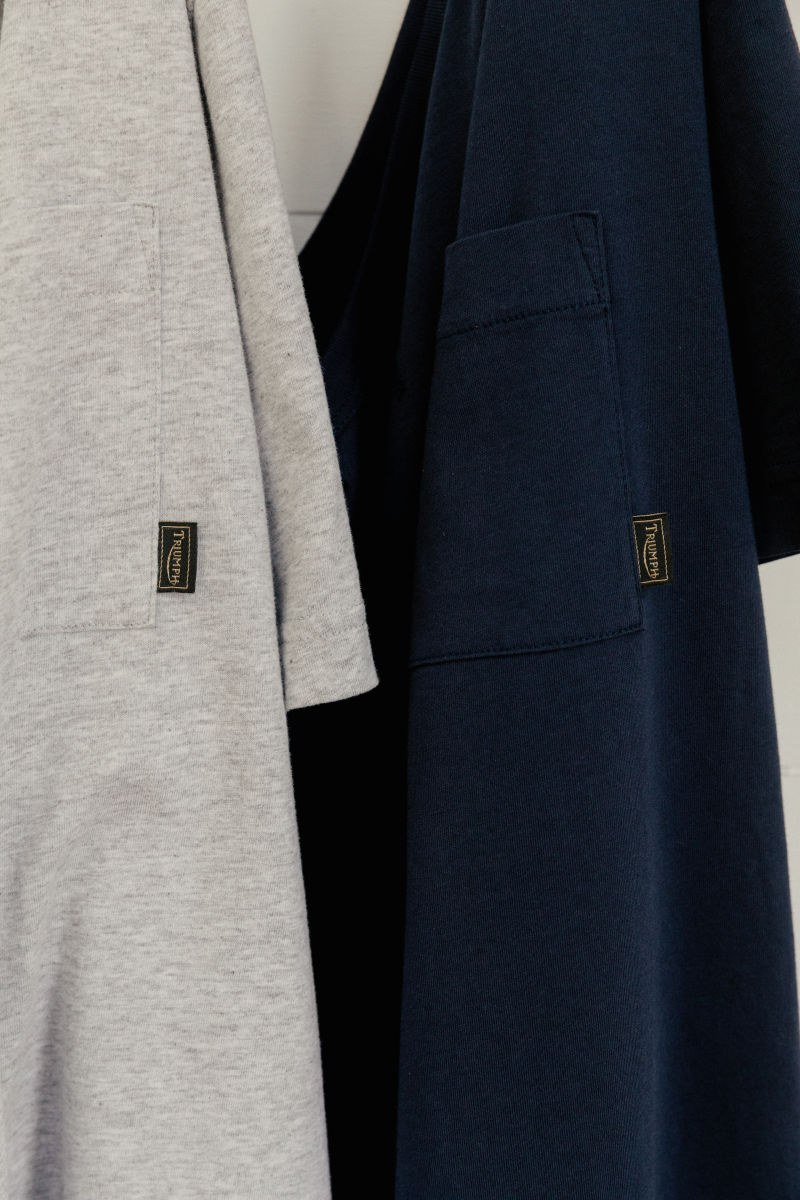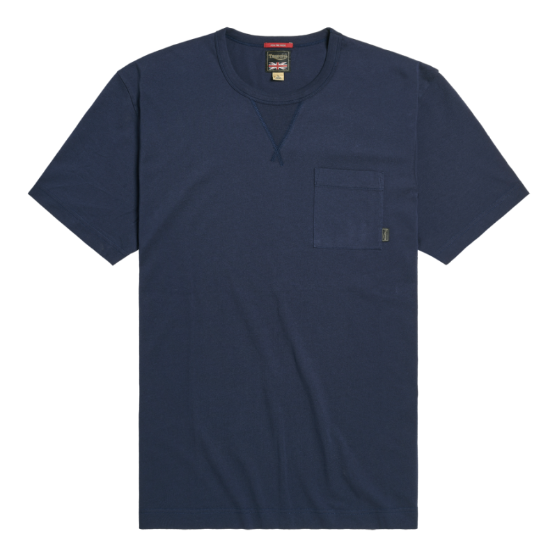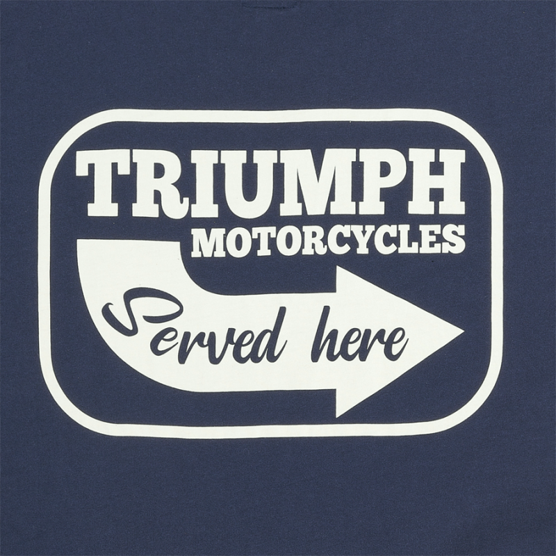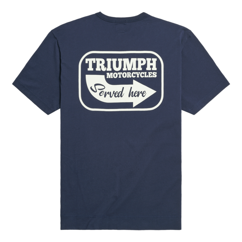 Classic fit crew neck, 100% cotton 160gsm Tee, with authentic V-insert neck detail and pocket to left chest. Indigo cotton jersey, featuring soft-feel 'Triumph Motorcycles Served Here' print on the back.UPS Shipping