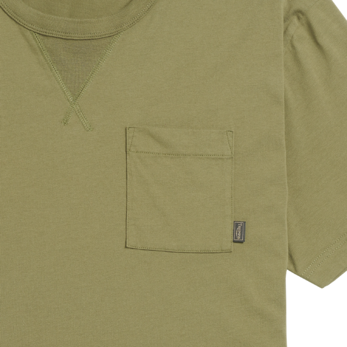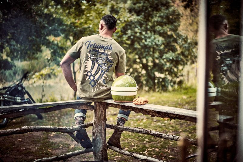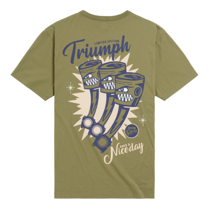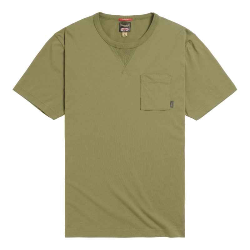 Classic crew neck tee with authentic V-insert neck detail and pocket to left chest. Olive green 160gsm cotton jersey, featuring soft-feel Triumph Motorcycles text and triple piston graphic inspired by vintage advertising, to the back.UPS Shipping